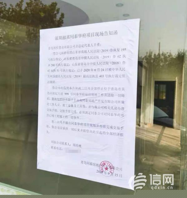 信網(wǎng)了解到,同泰華府小區(qū)于2013年11月份開(kāi)盤(pán),因開(kāi)發(fā)商同泰房地產(chǎn)公司與施工方存在糾紛被法院查封,從2014年底開(kāi)始該項(xiàng)目就逐漸停工建設(shè),原本約定的交房時(shí)間也被無(wú)限延期。后期經(jīng)有關(guān)部門(mén)協(xié)調(diào),2019年青島邦倬置業(yè)有限公司通過(guò)法院拍賣(mài)獲得該項(xiàng)目,并負(fù)責(zé)開(kāi)工建設(shè)。2020年9月同泰房地產(chǎn)公司在項(xiàng)目現(xiàn)場(chǎng)張貼出一張告知函稱(chēng),因法院執(zhí)行決定撤銷(xiāo),該公司要求青島邦倬置業(yè)有限公司3日內(nèi)撤離現(xiàn)場(chǎng)并與同泰房地產(chǎn)公司相關(guān)人員辦理交接手續(xù)。