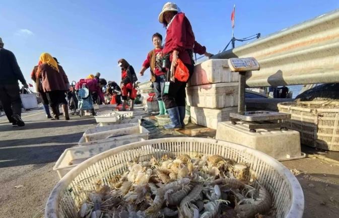 “快來看看啊!剛上岸的梭子蟹,35元一斤,保準(zhǔn)新鮮!睗O家大嫂王秀麗從船上接過一筐梭子蟹,麻利地放在攤位上,大聲吆喝起來。她的攤位前很快圍滿了人,有的市民已經(jīng)迫不及待地蹲下身,用手輕輕捏著蟹子的腹部,挑選著肥美的梭子蟹。